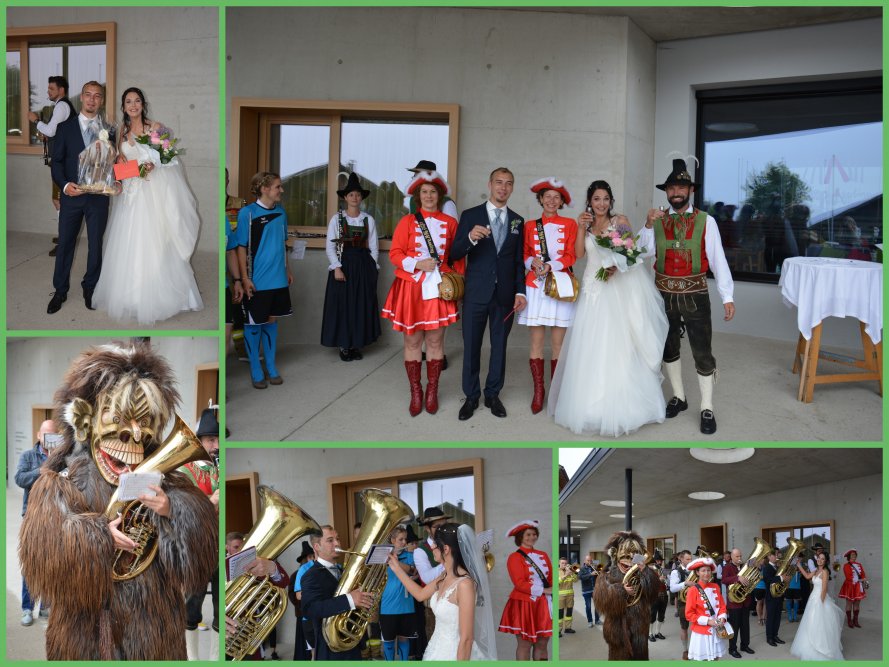 Am Samstag war dann die Hochzeit von unserem ehemaligen Bassisten Jungmann Andi und seiner Viky. Andi war 16 Jahre Mitglied der Musikkapelle und fleißiger Messspieler und Turmbläser und deshalb stellten wir mit Vereinsmitgliedern der Feuerwehr, den Vidrolern, dem Theater, der Krampusse, der Gemeinde und der Musik eine Hochzeitscombo zusammen und überraschten das Brautpaar mit ein paar Märschen. Lieber Andi und liebe Viky, eure Freunde der MK Assling wünschen euch viel Glück für eure gemeinsame Zukunft.