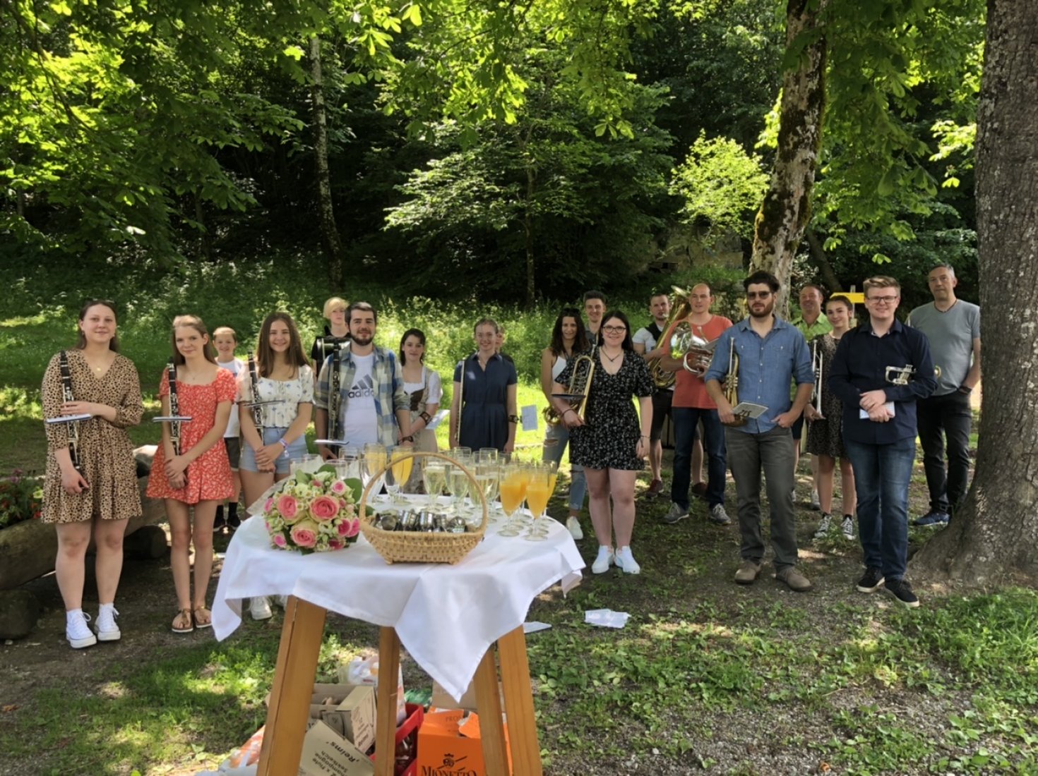 Vergangenen Samstag spielten wir für unsere Flötistin Stefanie und ihren Mann Stephan ein Ständchen im Anschluss an ihre standesamtliche Trauung. Dazu trafen wir uns auf Schloss Bruck um dem Brautpaar mit ein paar Märschen zu gratulieren und auf ihr gemeinsames Glück anzustoßen.