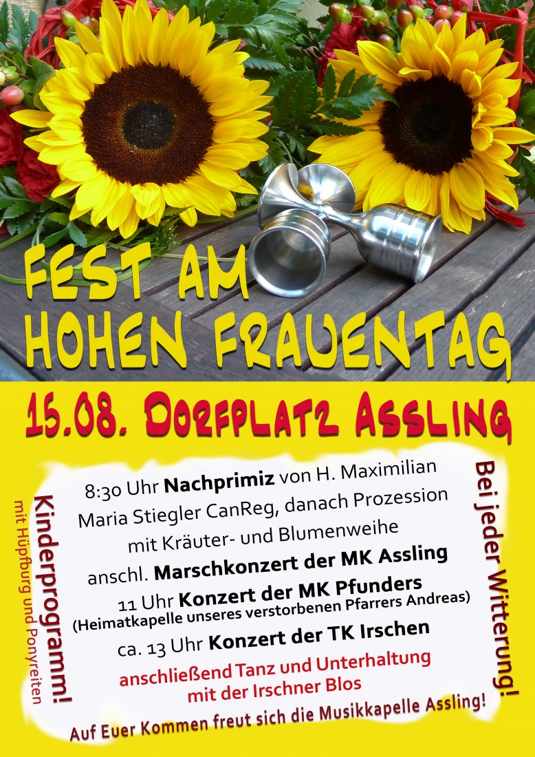 In knapp einer Woche ist es wieder soweit und unser traditionelles Fest am Hohen Frauentag findet wieder am Asslinger Dorfplatz statt.