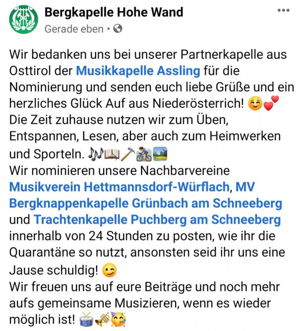 Unsere Partnerkapelle Hohe Wand und unsere Nachbarn aus Bannberg haben es sich natürlich nicht nehmen lassen und innerhalb von 24h auf unsere Herausforderung reagiert. Leider wird´s nix mit der Jause aber dafür kommt hoffentlich ein baldiges Wiedersehen.