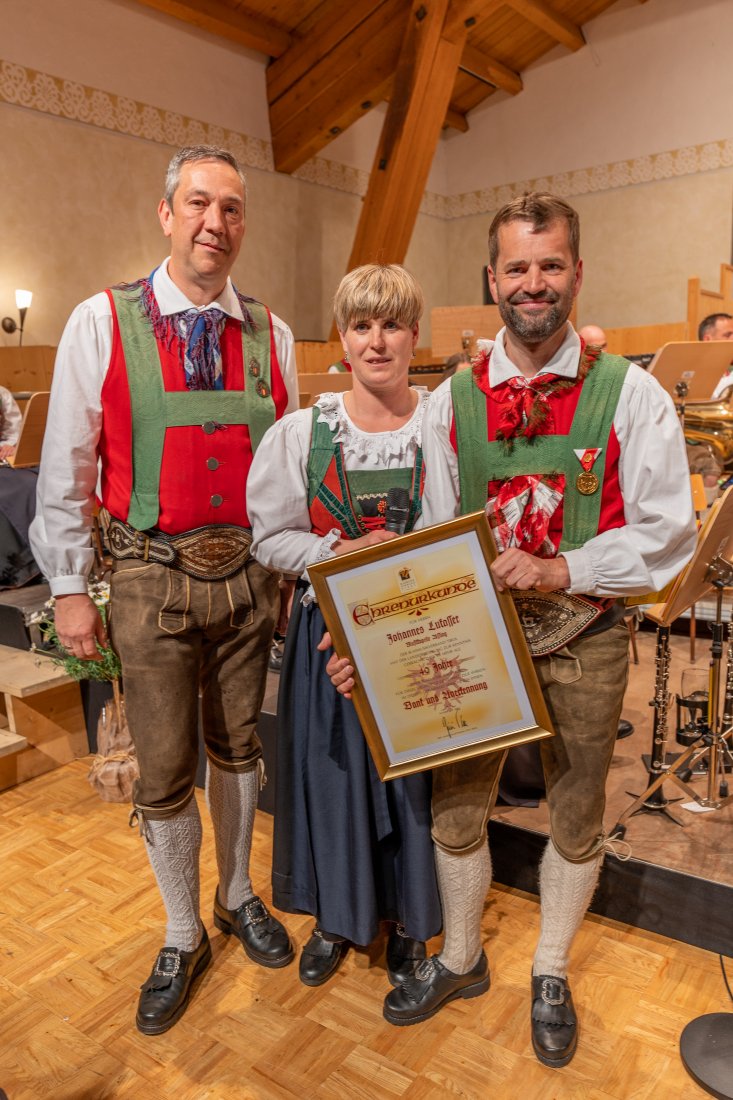 Besonders freut es uns, dass wir Hannes Lukasser bereits seit 40 Jahren in unseren Reihen haben. Aus diesem Grund erhielt er vom Blasmusikverband Tirol die Medaille in Gold für 40 Jahre Mitgliedschaft. „Auch wenn er aus beruflichen Gründen nicht immer dabei sein kann, so ist Hannes immer zur Stelle, wenn er Zeit hat und wenn es nur eine Prozession ist“ - um es mit den Worten unserer Obfrau Astrid zu sagen. Hannes ist nicht nur musikalisch eine große Stütze für die Musikkapelle, sondern auch bei der Organisation der Technik. Alljährlich nimmt er das Frühjahrkonzert für uns auf - so auch in diesem Jahr.